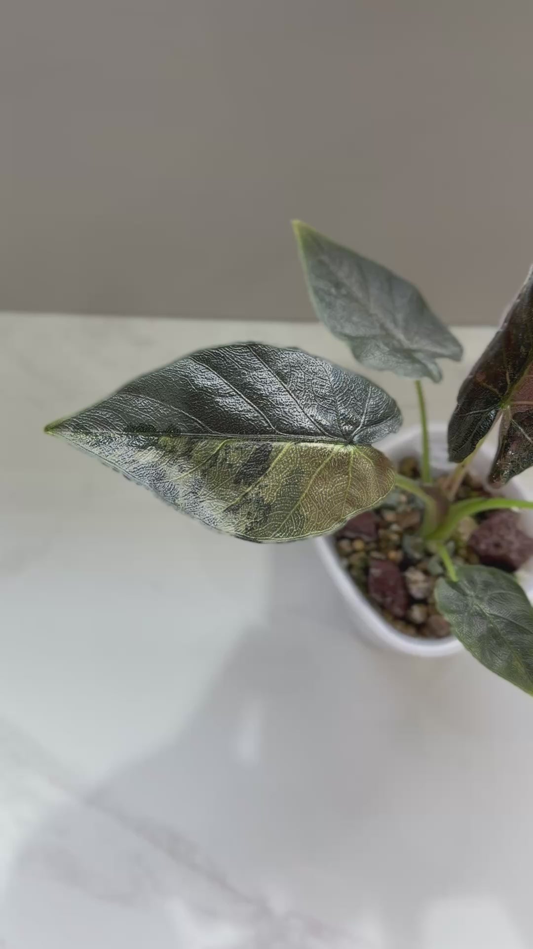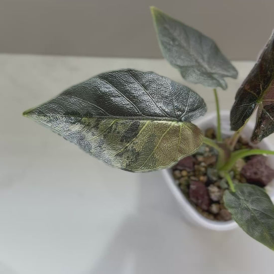Ideal for serious collectors seeking the absolute rarest specimens, this tri-colored form combines the beloved velvety texture with extraordinary multi-toned coloration that sets it apart from standard varieties. The combination of textured leaves, green on green variegation, metallic bronze tones, subtle pink colouring, and extreme rarity ensures this ultra-rare collector's houseplant represents the pinnacle of Alocasia collecting and rainforest discovery.