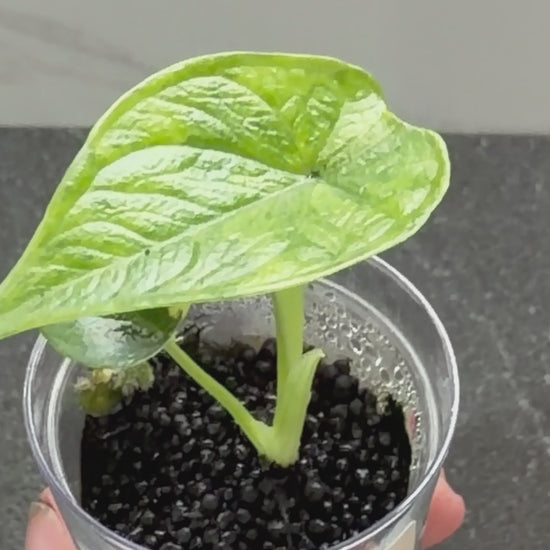 The Albo Alocasia captivates with striking white variegation against unique shaped leaves, creating stunning marble-like patterns on each specimen.