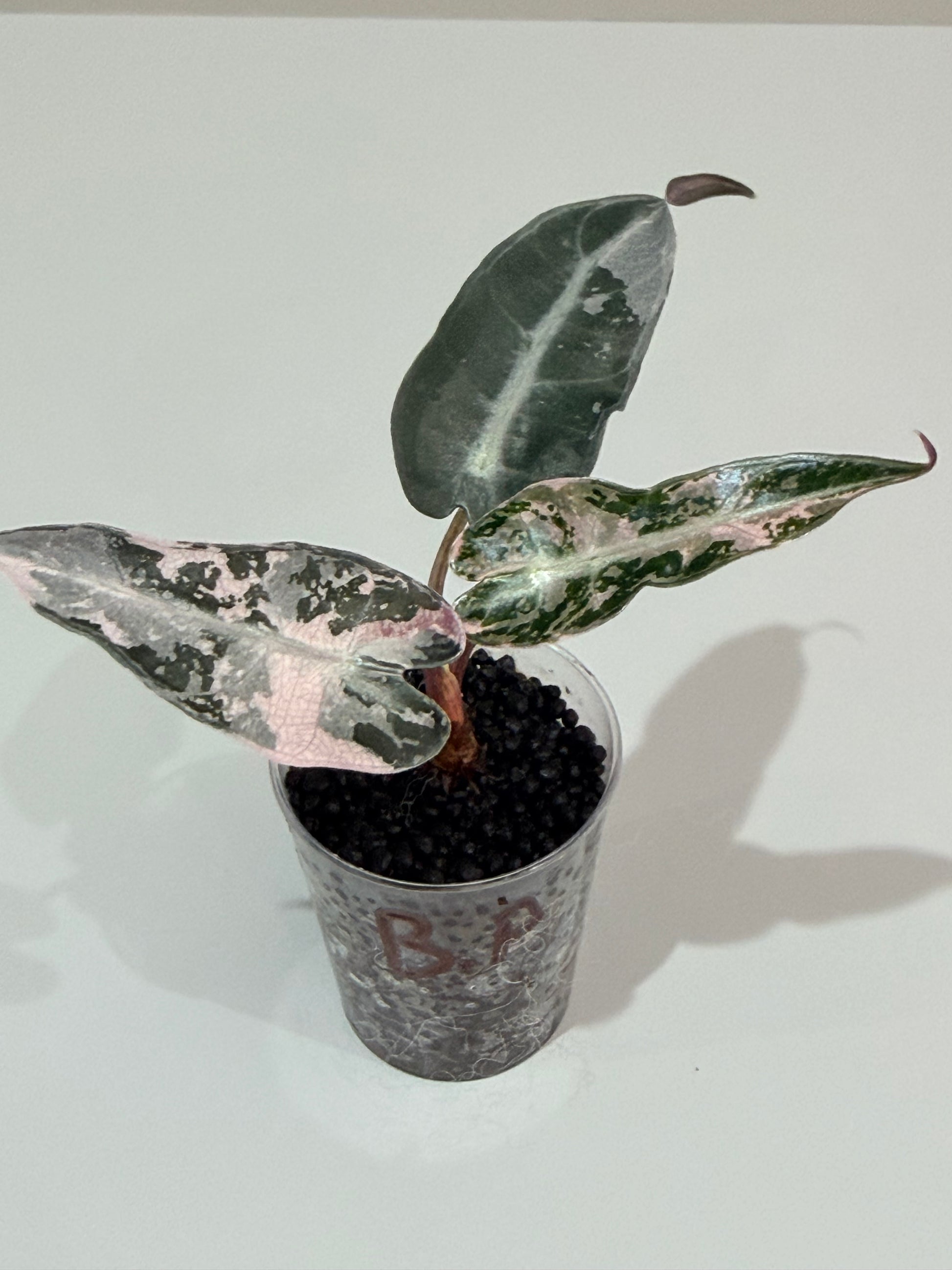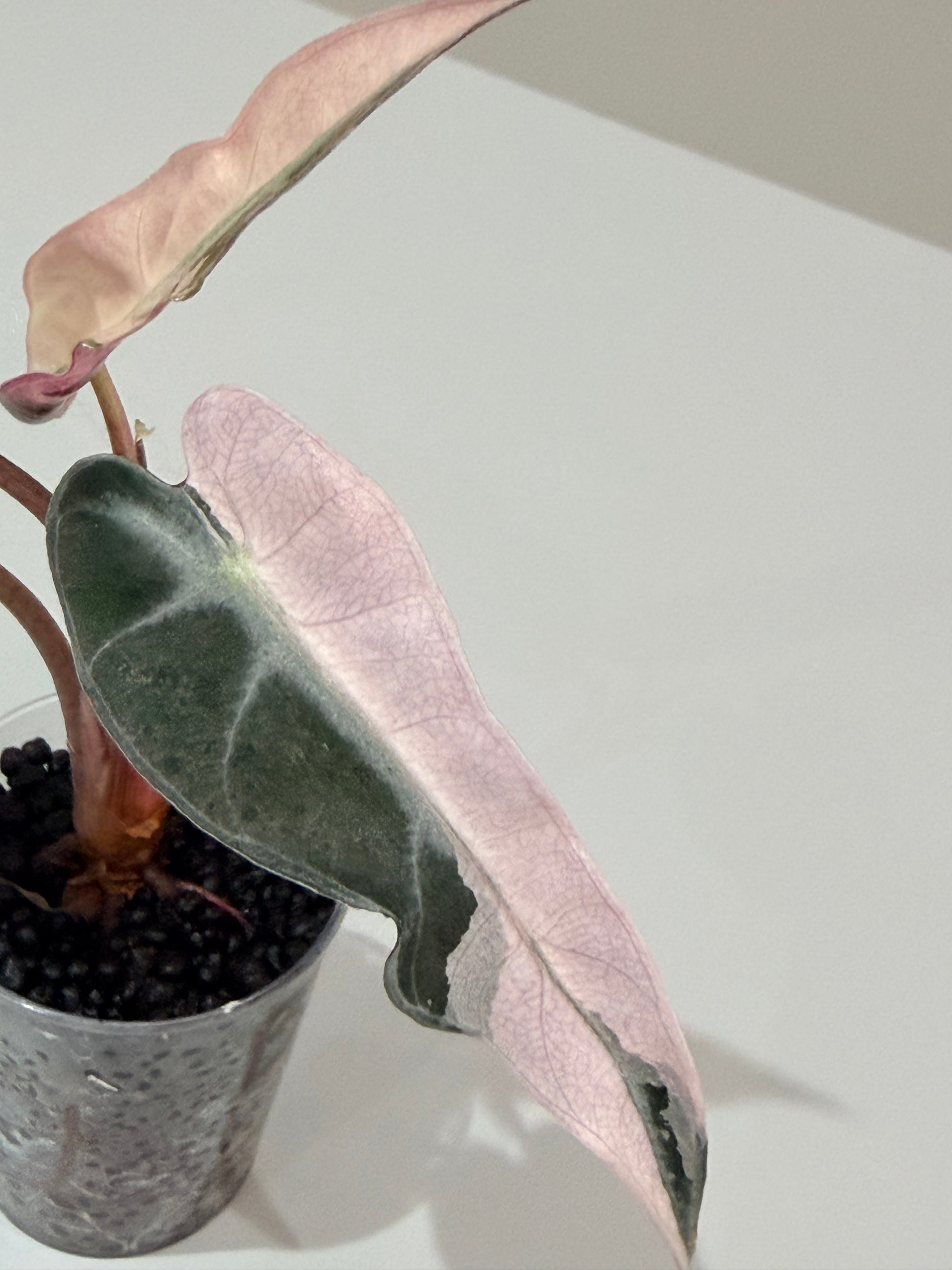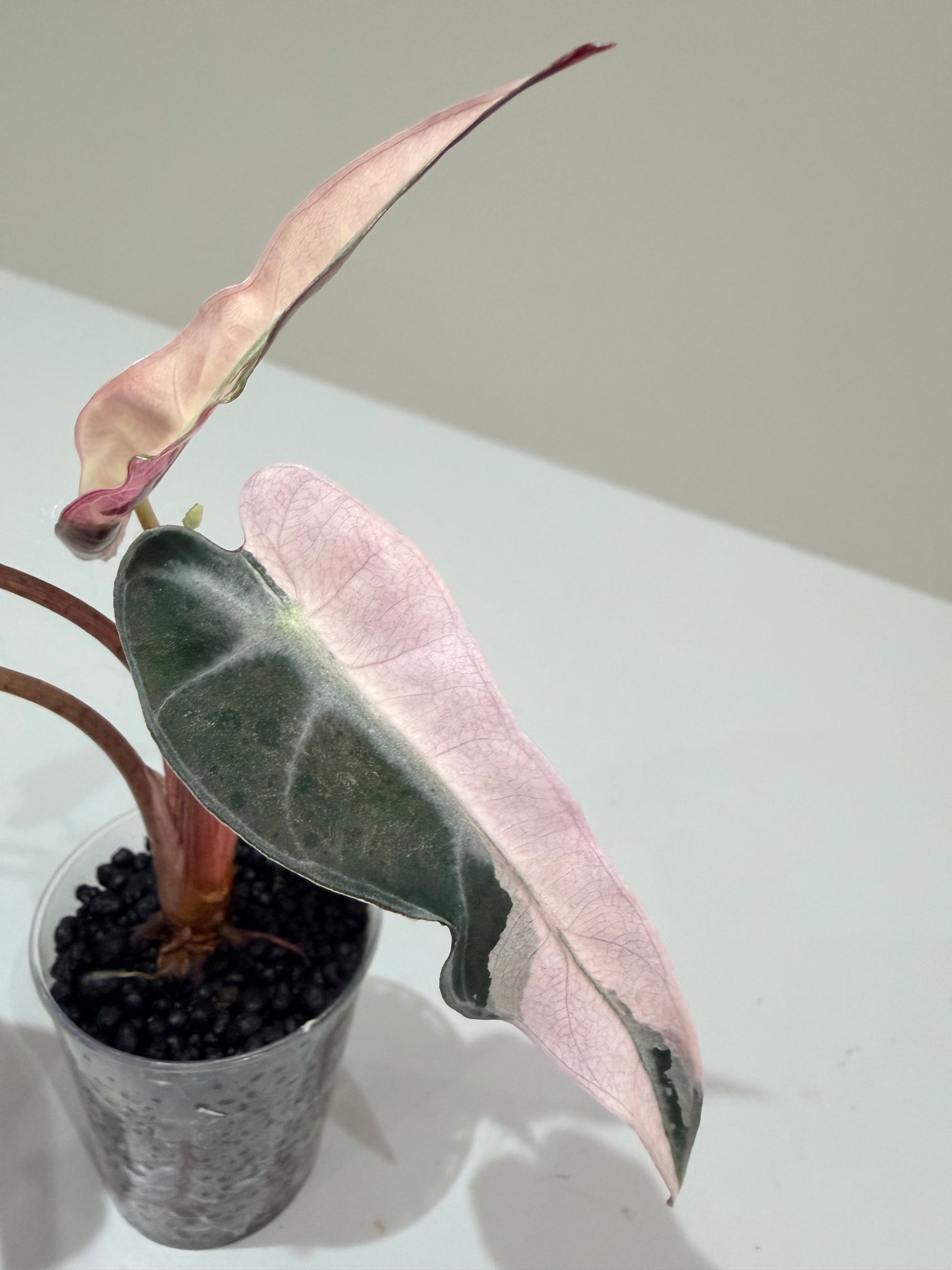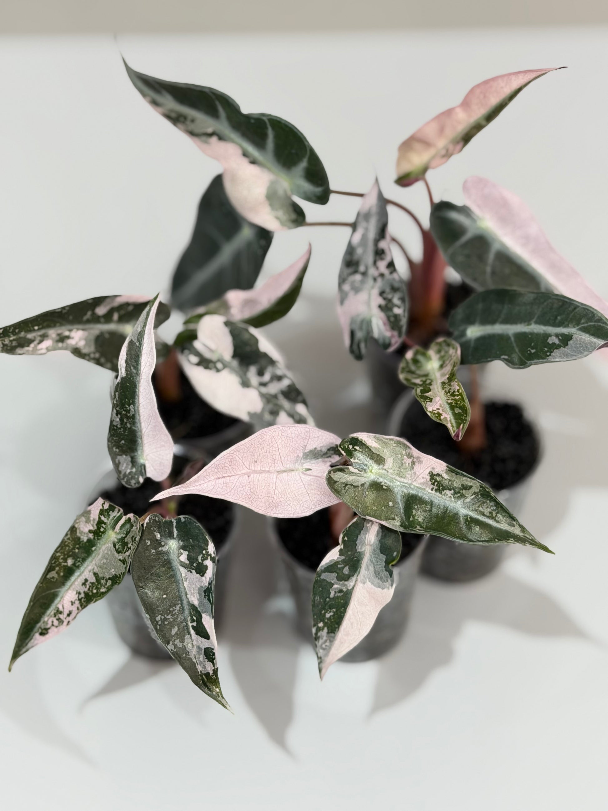 This exceptionally rare cultivar captivates serious enthusiasts with its unique splashes of pastel pink that make each leaf completely individual, transforming this compact Alocasia into a statement piece coveted by collectors worldwide. The pink variegation proves particularly rare because stable pink tones in Alocasias are notoriously difficult to achieve and maintain, making this Southeast Asian beauty a true grail plant with only limited numbers available globally.