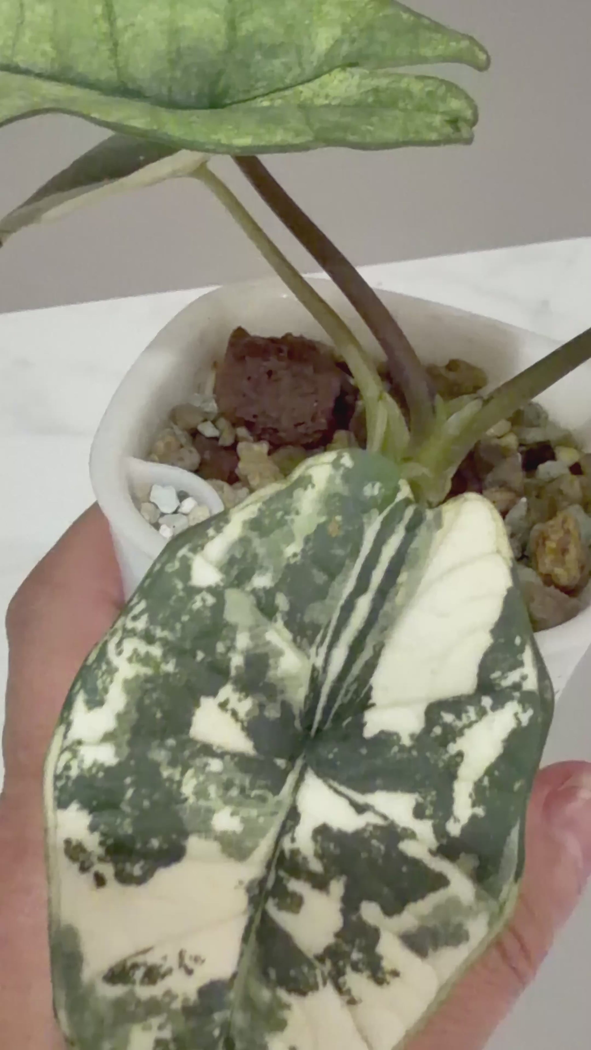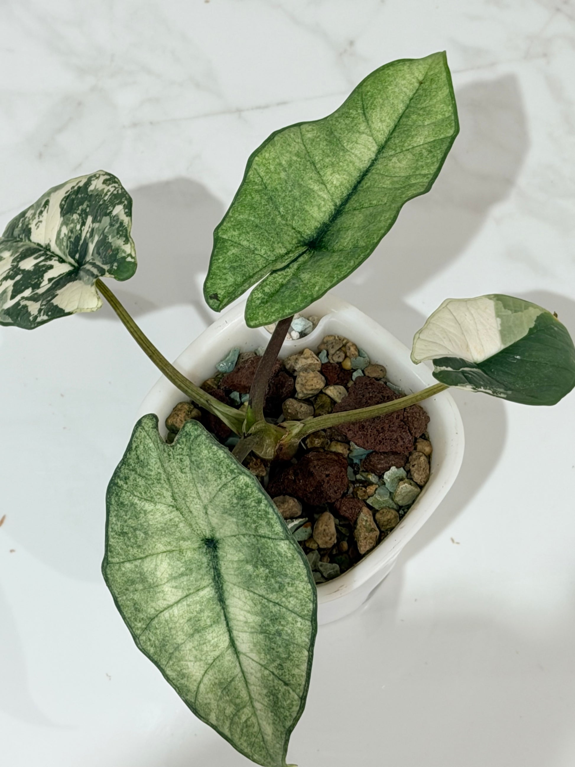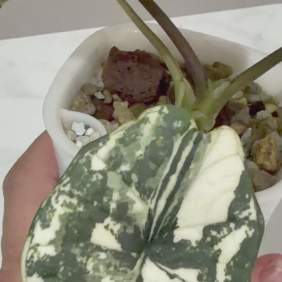 The Albo Alocasia captivates with striking white variegation against unique shaped leaves, creating stunning marble-like patterns on each specimen.
