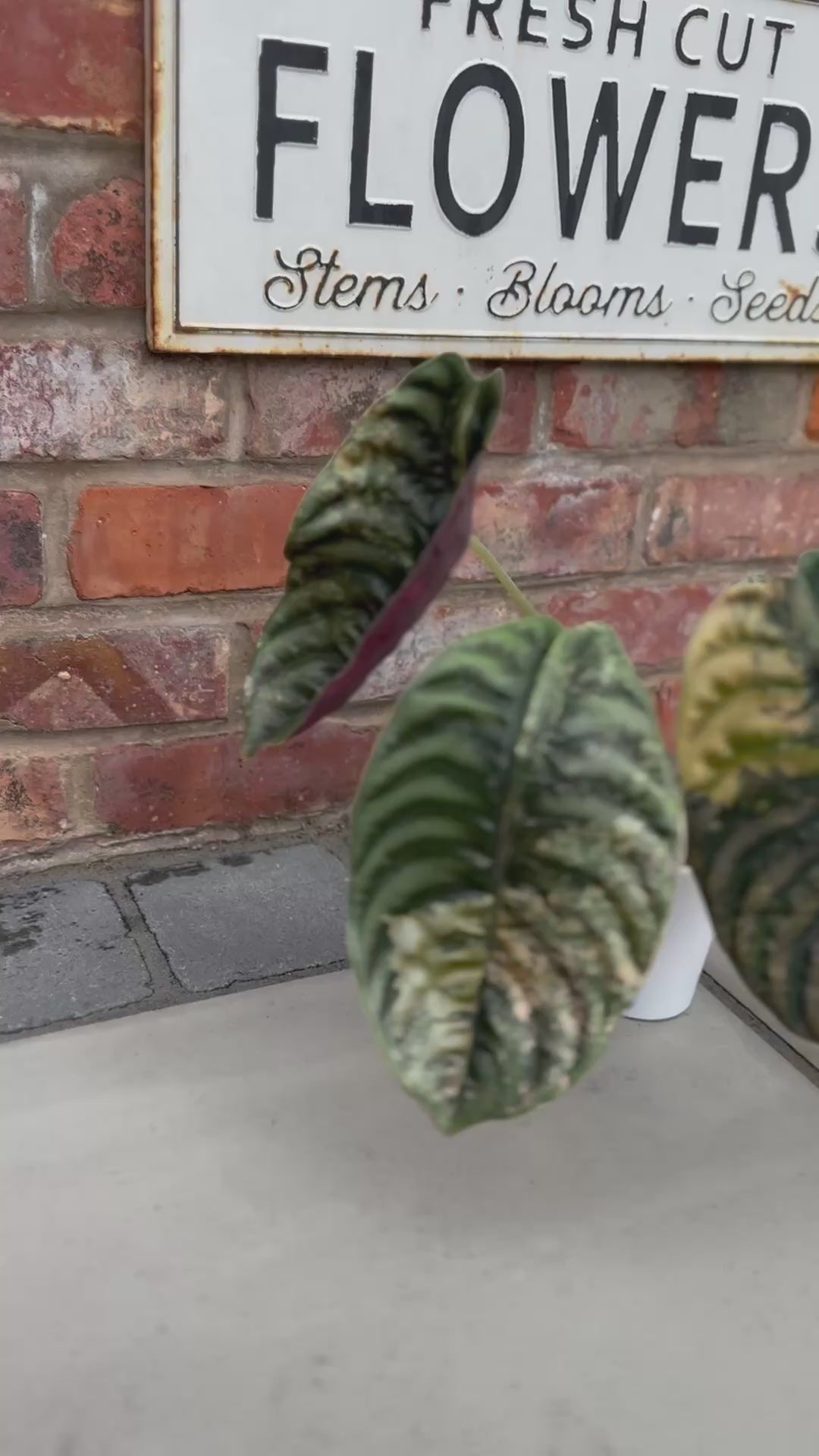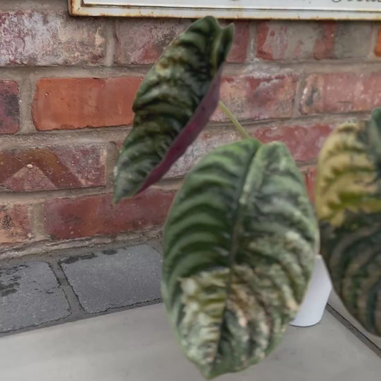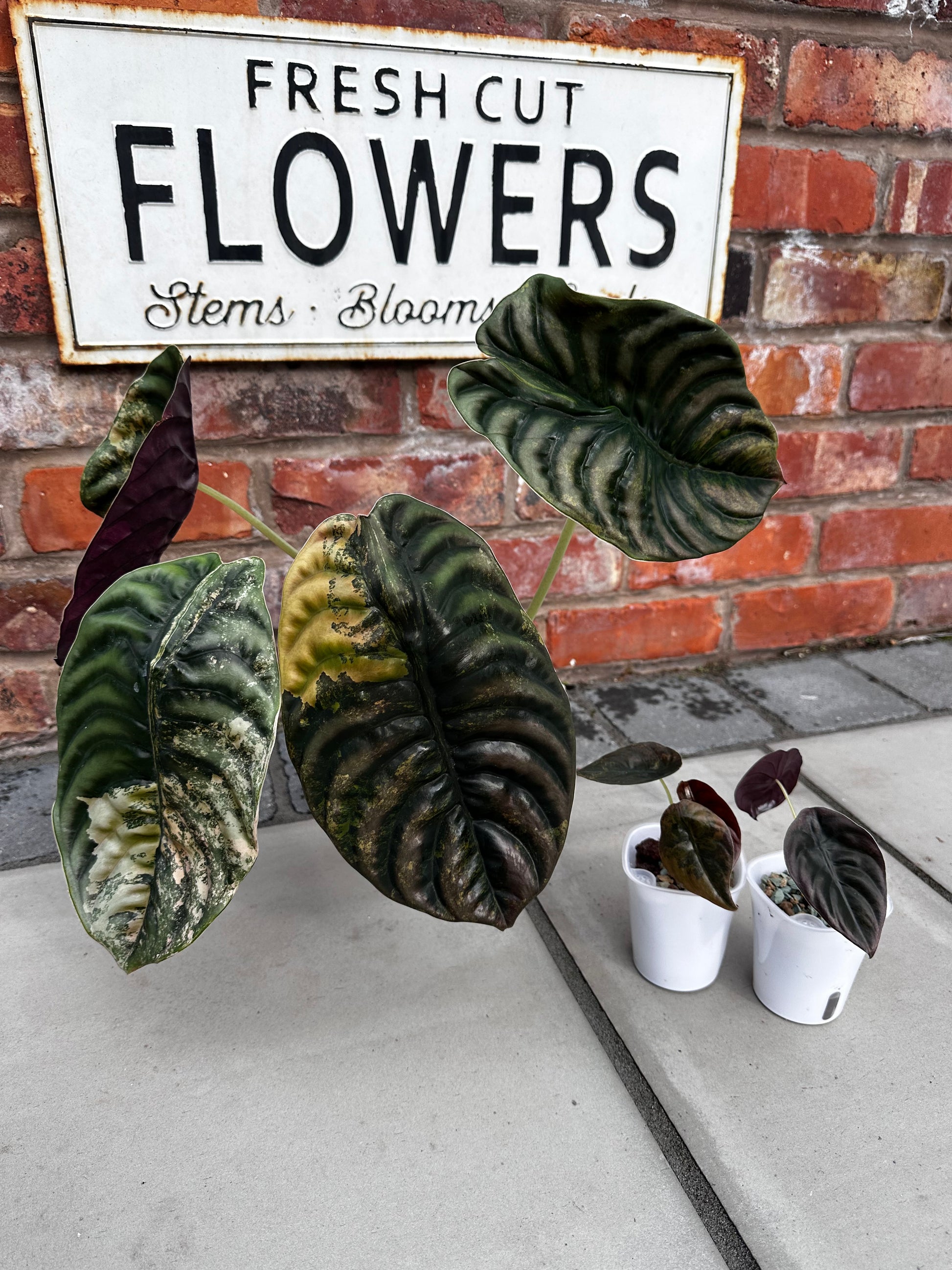 The Albo Alocasia captivates with striking white variegation against unique shaped leaves, creating stunning marble-like patterns on each specimen.