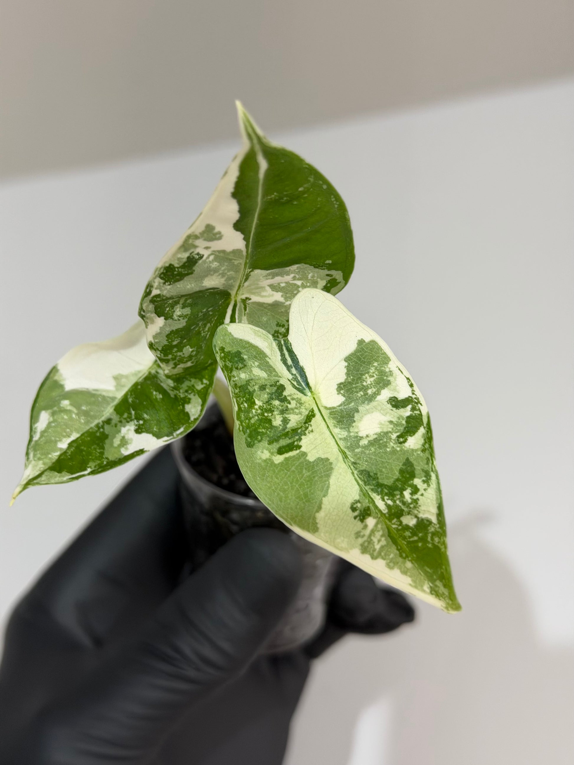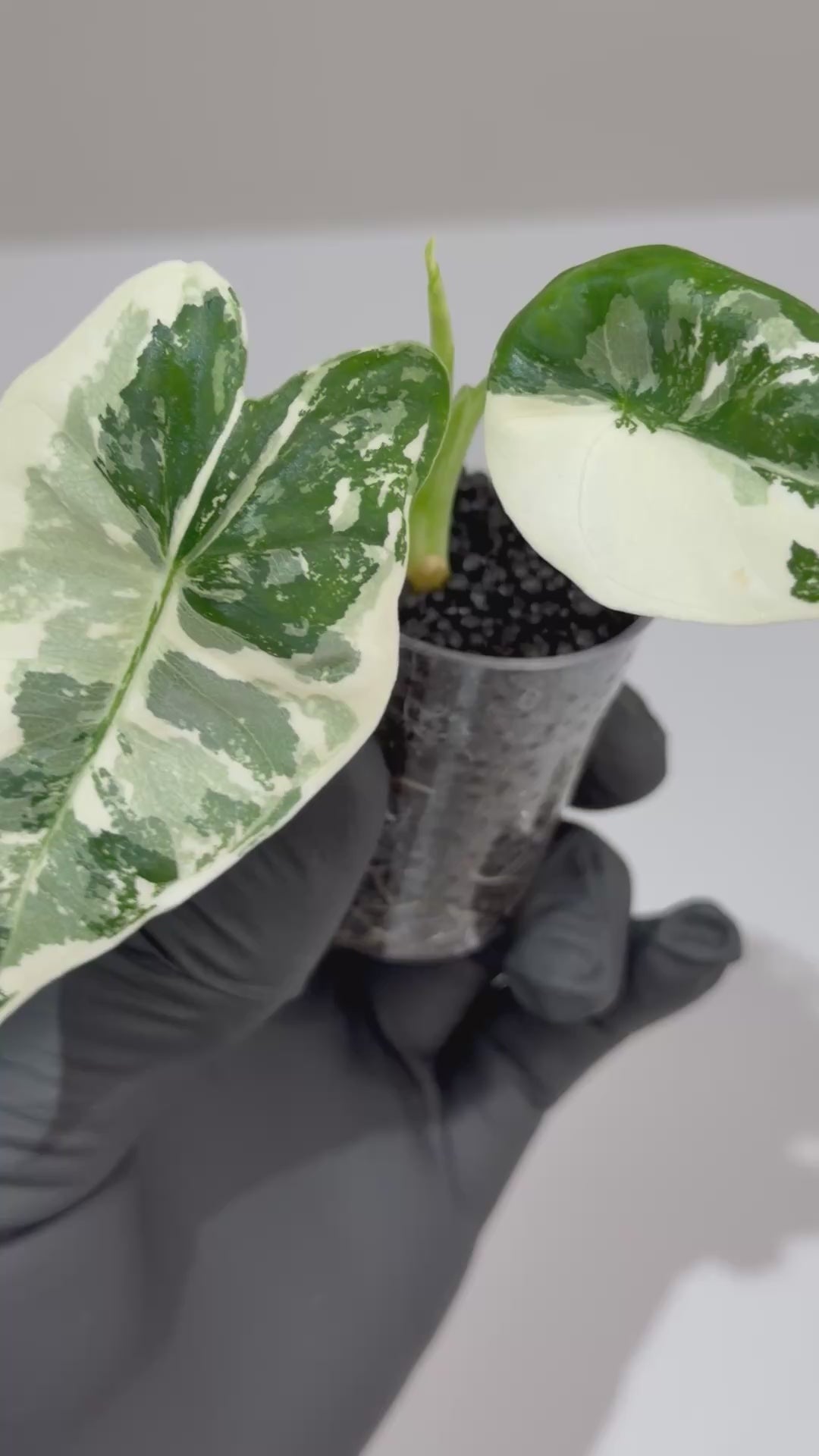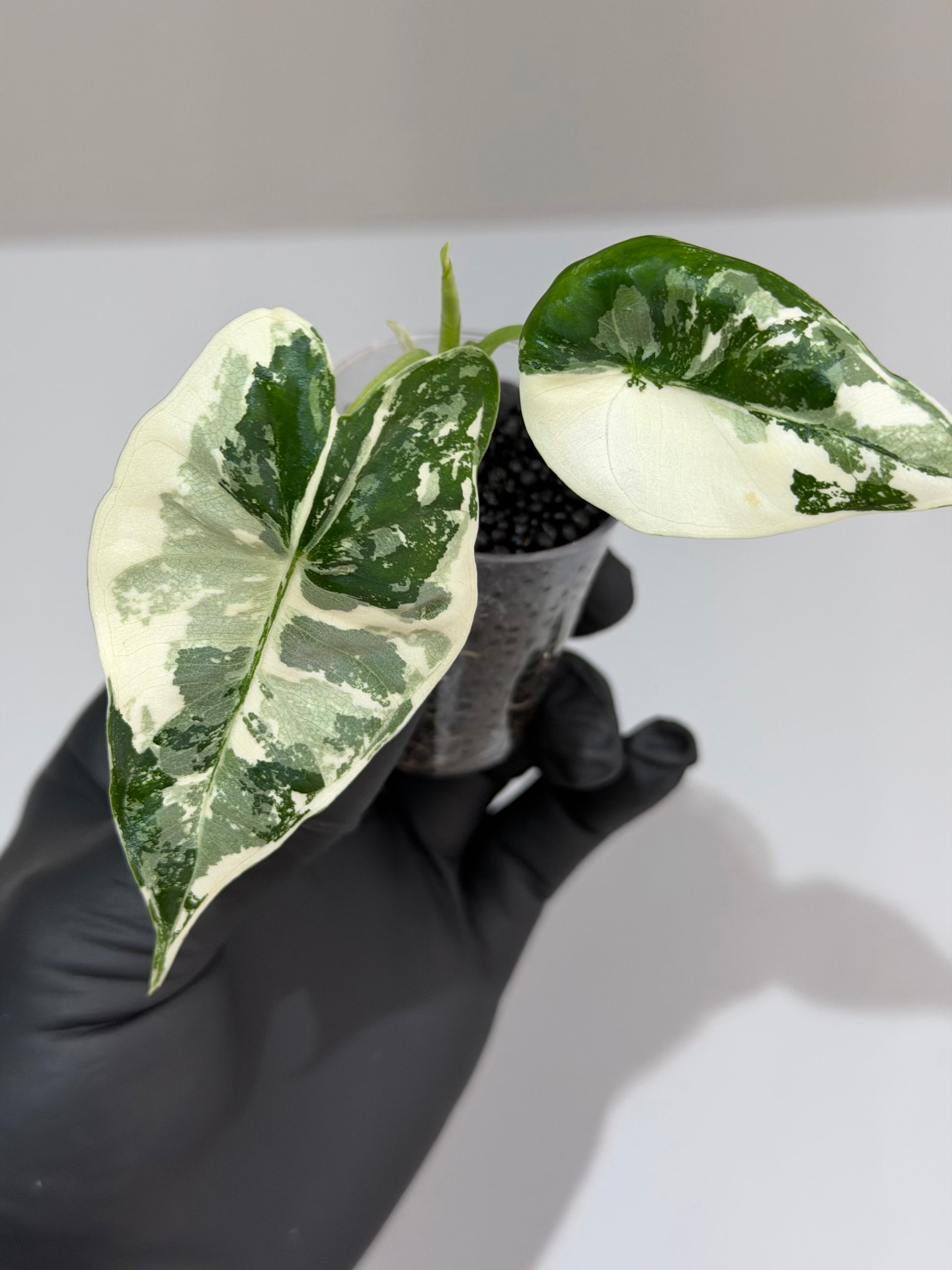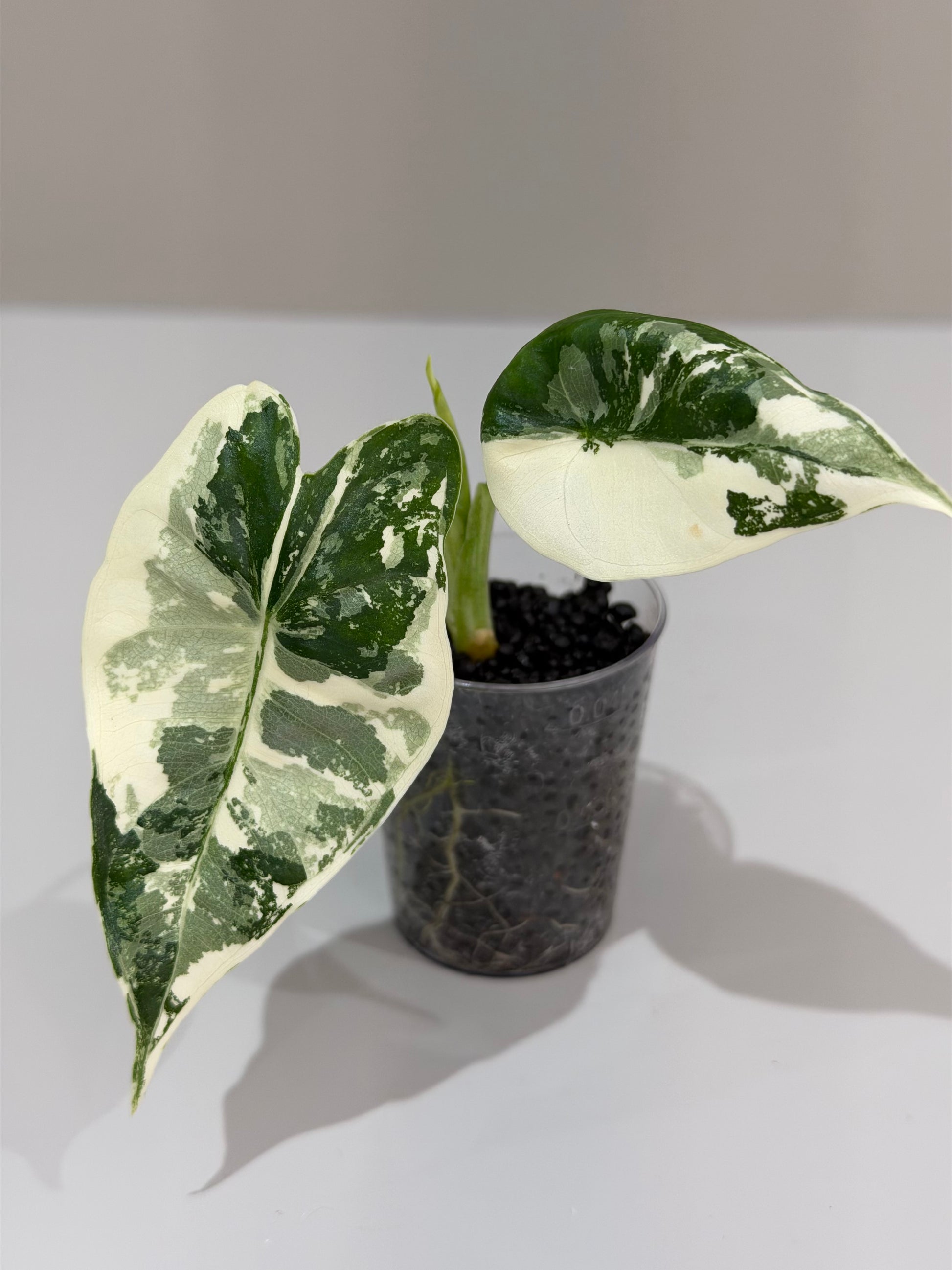 The Albo Alocasia captivates with striking white variegation against unique shaped leaves, creating stunning marble-like patterns on each specimen.