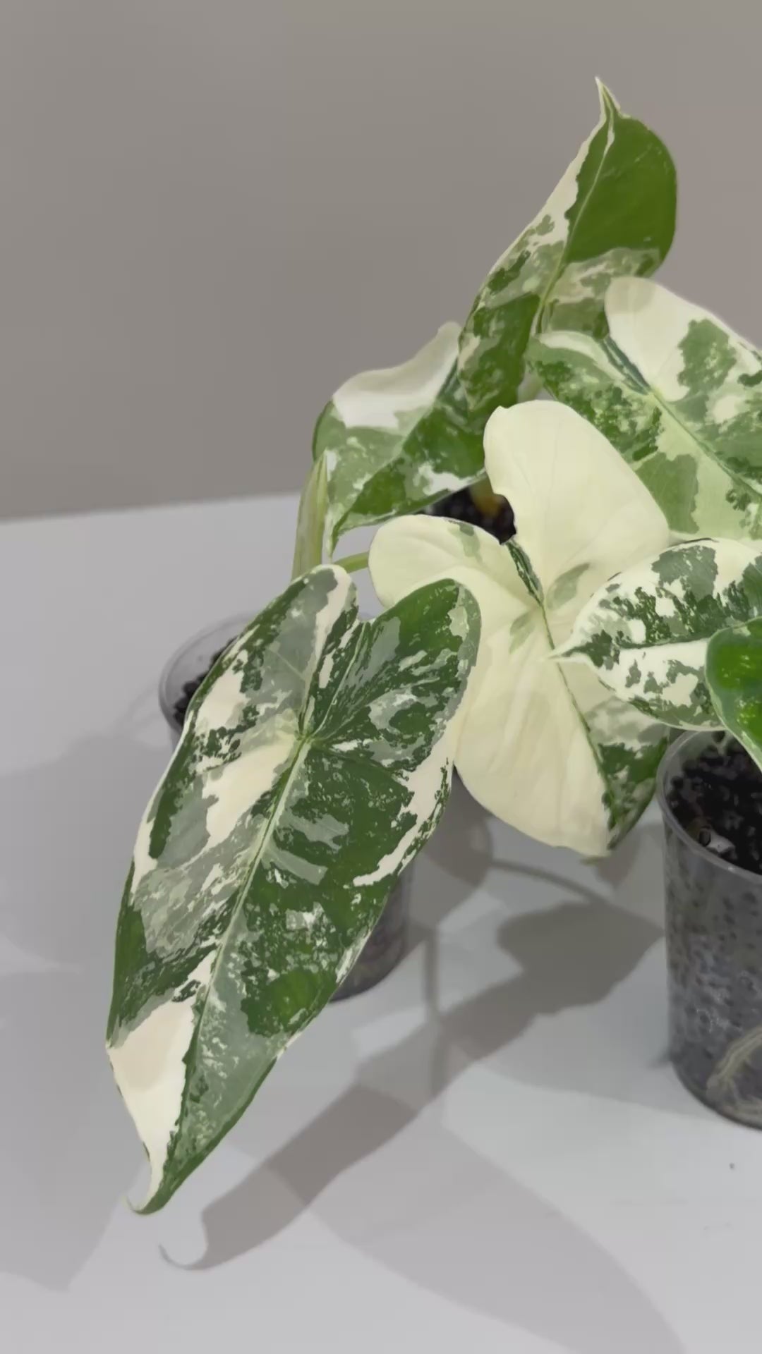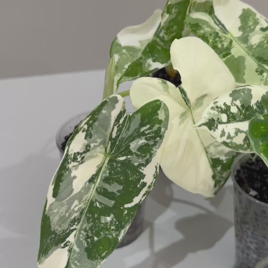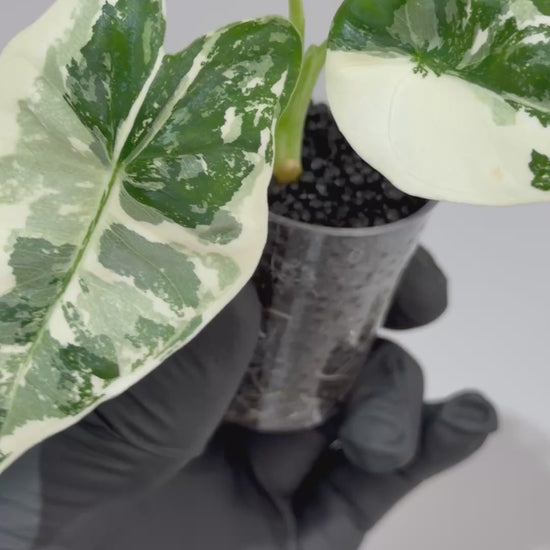 The Albo Alocasia captivates with striking white variegation against unique shaped leaves, creating stunning marble-like patterns on each specimen.