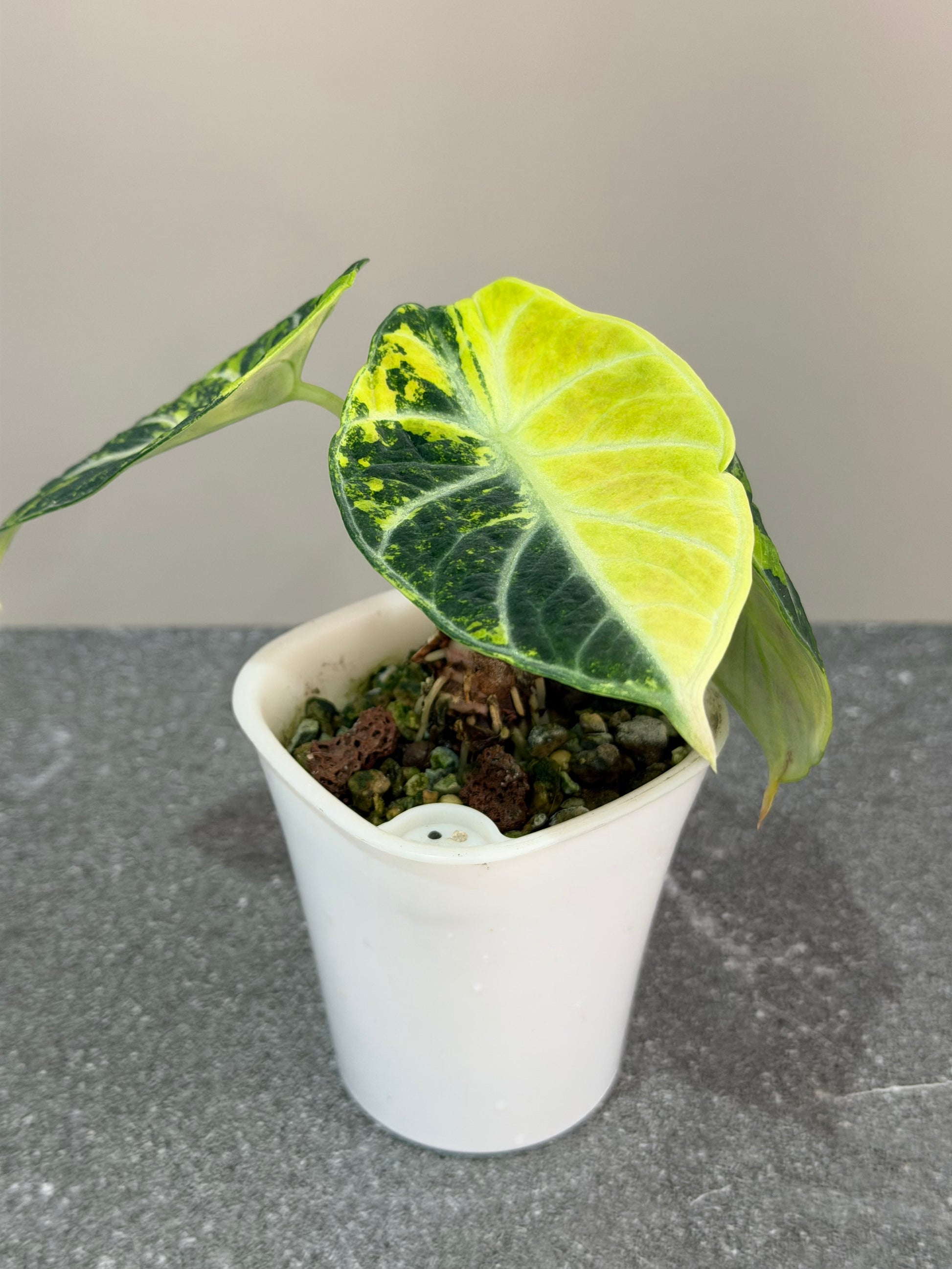 The Albo Alocasia captivates with striking white variegation against unique shaped leaves, creating stunning marble-like patterns on each specimen.