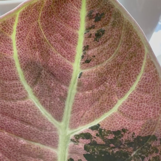 The Pink Variegated Alocasia enchants with bright pink splashes against emerald foliage, creating a bold, dreamlike quality. This rare botanical treasure adds a striking, vivid touch to any plant collection with its radiant tropical charm.