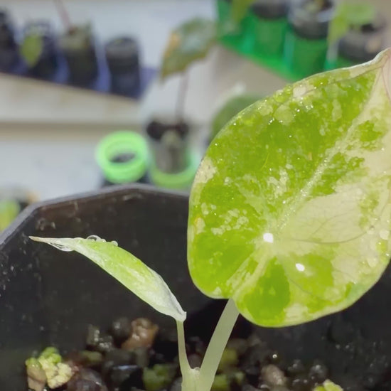 The Albo Alocasia captivates with striking white variegation against unique shaped leaves, creating stunning marble-like patterns on each specimen.