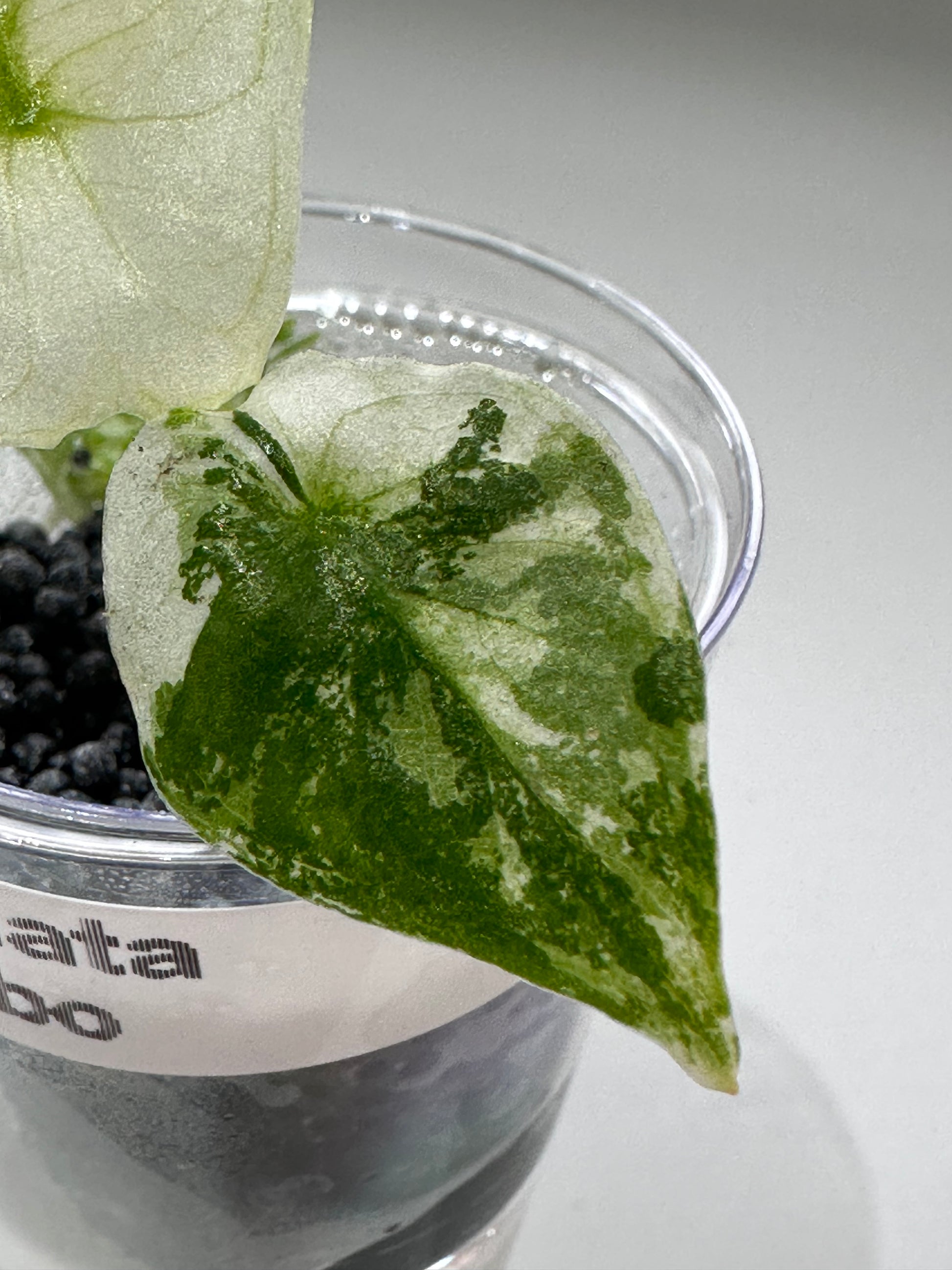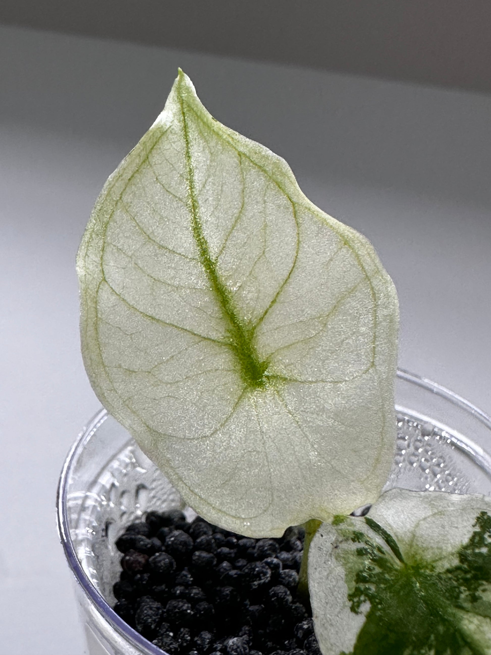 The Albo Alocasia captivates with striking white variegation against unique shaped leaves, creating stunning marble-like patterns on each specimen.