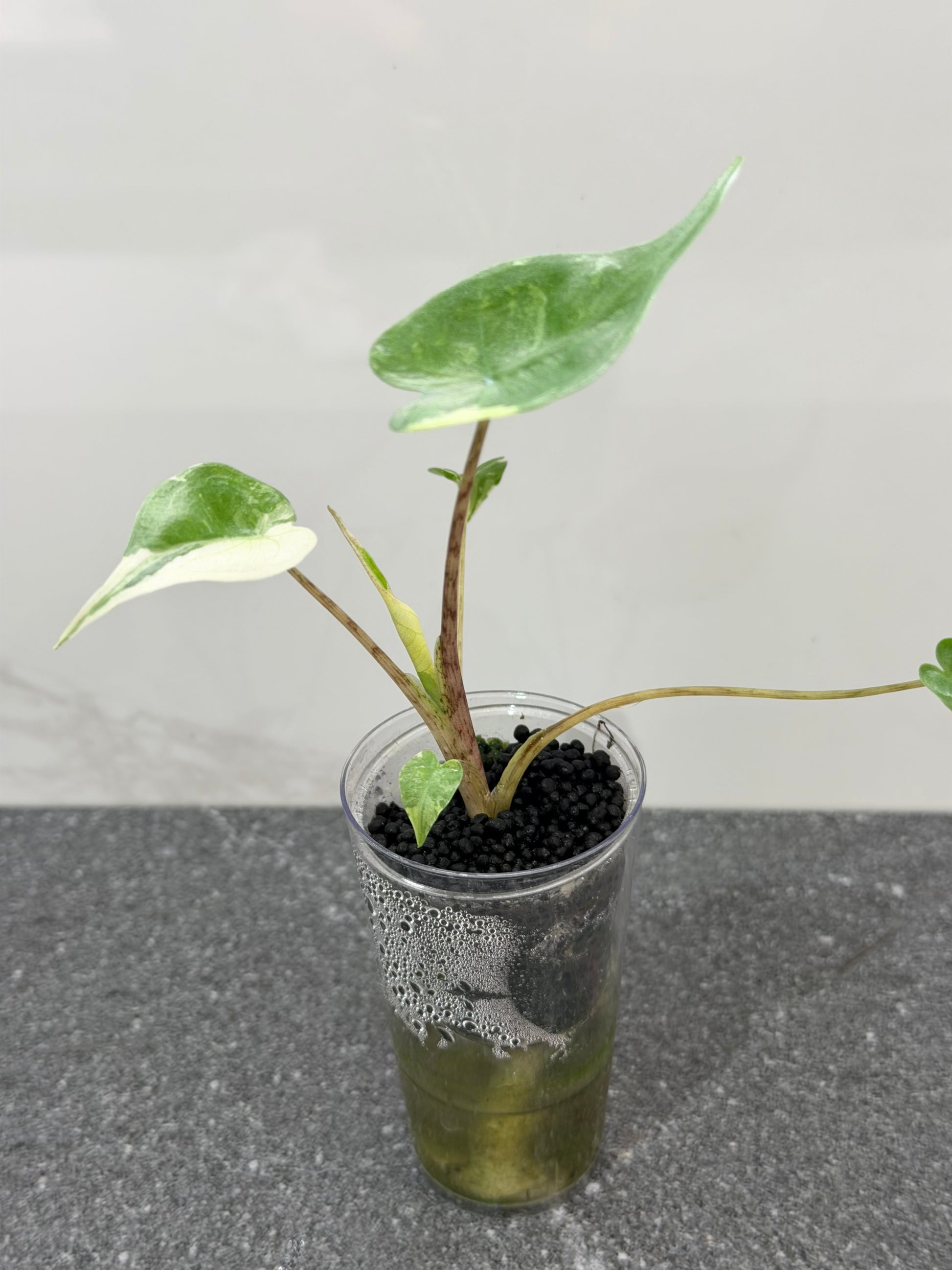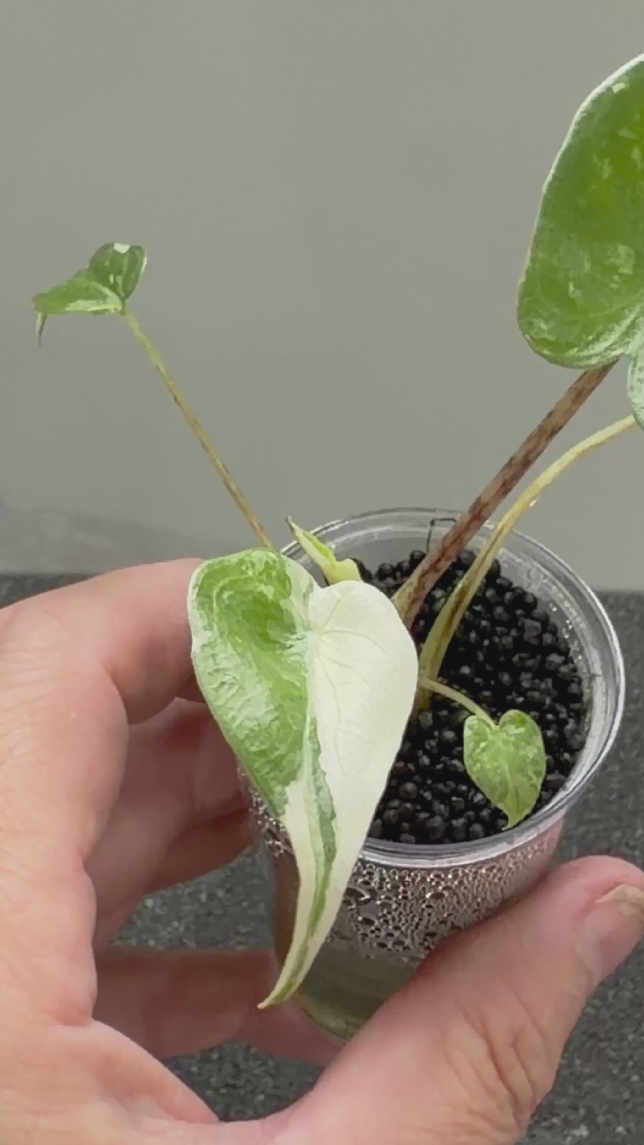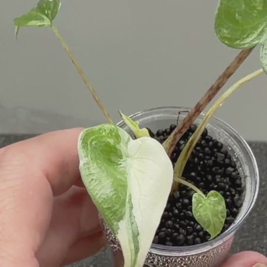 Key Features: • Rare pink and white variegated form of Stingray • Unique upward-pointing leaves mimic stingray silhouette • Vibrant pink and white variegation against deep green tones • Rippled leaf edges and bold dappled stems • Variegation becomes more pronounced with bright indirect light • Highly sought-after for unusual form and rarity • Must-have for serious Alocasia collectors