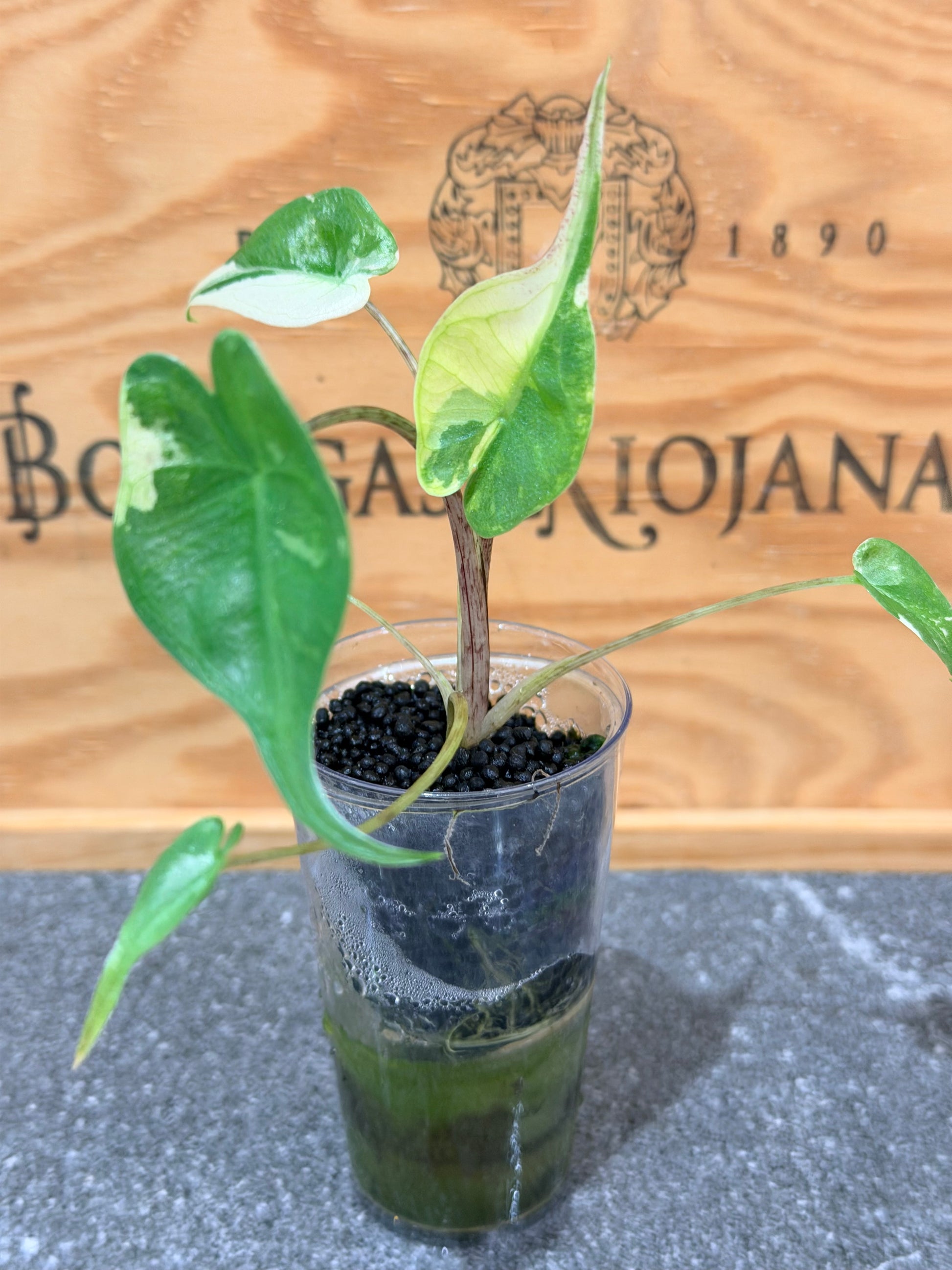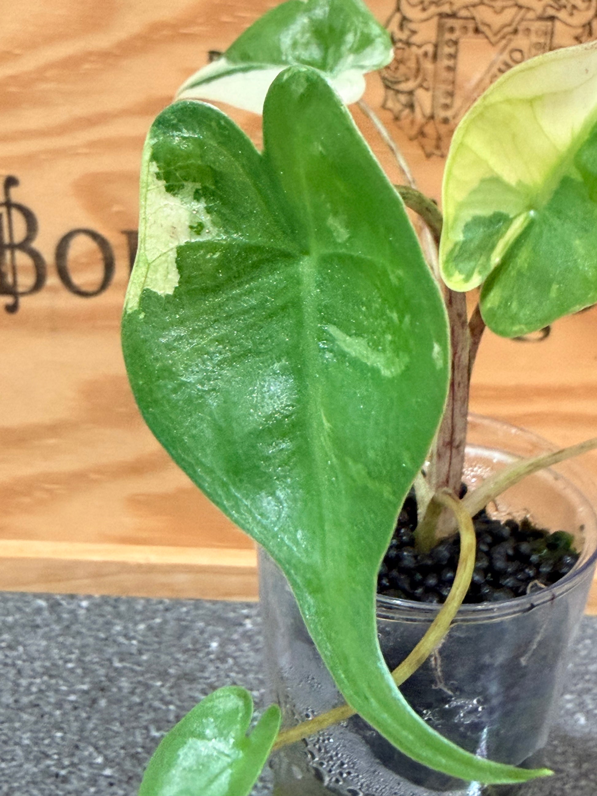 The Albo Alocasia captivates with striking white variegation against unique shaped leaves, creating stunning marble-like patterns on each specimen.