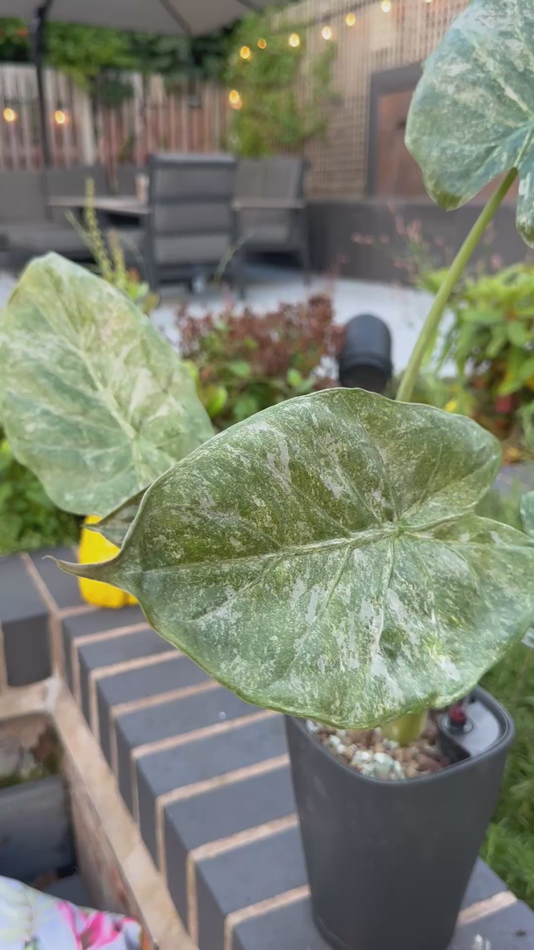 The Albo Alocasia captivates with striking white variegation against unique shaped leaves, creating stunning marble-like patterns on each specimen.