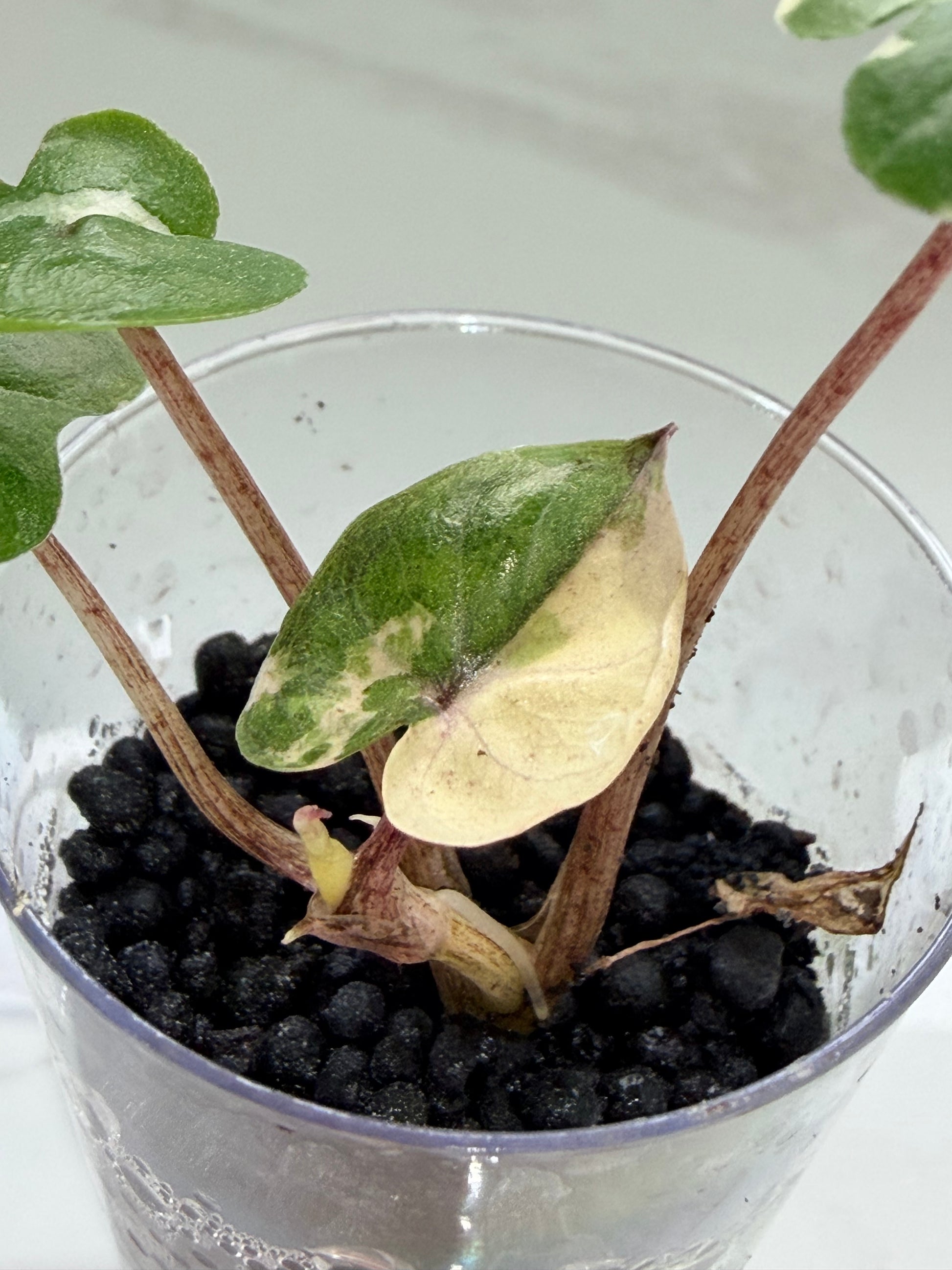 The Albo Alocasia captivates with striking white variegation against unique shaped leaves, creating stunning marble-like patterns on each specimen.